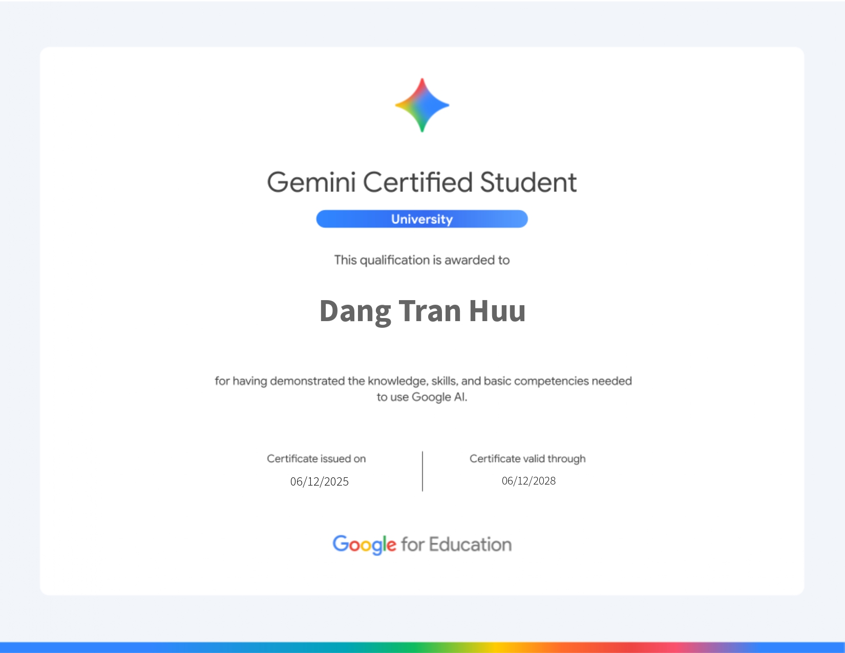 Việc sở hữu Certificate Gemini Educator hoặc Student là sự chứng minh mạnh mẽ nhất về khả năng bạn làm việc hiệu quả với các Mô hình Ngôn ngữ Lớn (LLMs).